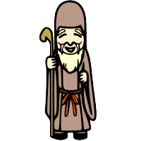 低い背に白い頭、ヒゲ長く、左手に宝珠、右手に巻物を括り付けた杖をもつ。