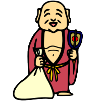 七福神の中で唯一実在の人物。弥勒菩薩の化身といわれる。大きな袋の中に宝物がいっぱい入り、人々に与えたという。額が広く、肥って背低く、腹が大きく、一本の杖と布袋を背負っている。