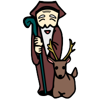 手には巻物を括り付けた杖、そして団扇や桃などを持ち、身辺に一頭の牡鹿を伴う。長寿延命、富貴長寿の神