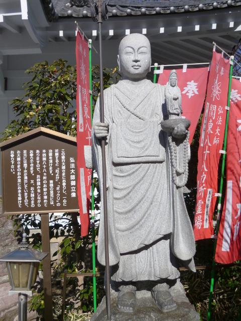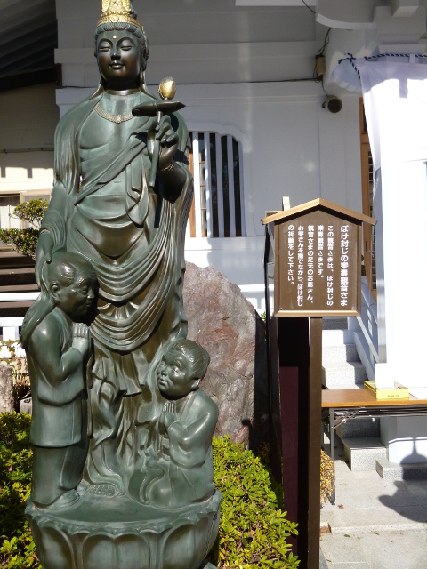 このお寺の御本尊は木彫坐像の薬師如来。境内には、七福神の他、ぼけ封じ観音、ポックリ大師、水琴窟、仏足石、戒壇めぐりがあります。